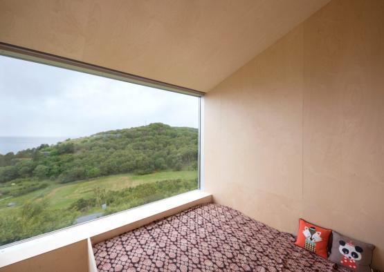 In order to create a minimal footprint on the isolated natural environment, Cabin Stokkoya sits on a concrete slab only at the back of its structure, while the front half perches gently on removable piles. This also gives a sense of floating, and creates a high vantage point for catching views over the vegetation.