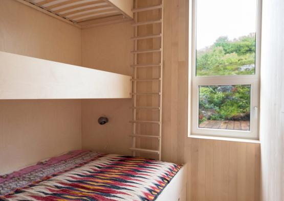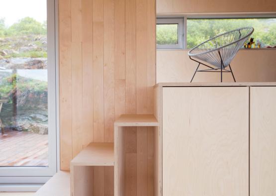 Integrated storage and furniture was an essential part of the interior designing for the cabin. Birch plywood, boards and veneers were used to line the interior and create the furniture. A series of plywood stairs are dispersed throughout the levels, with all having integrated cabinetry inside them, saving on storage space, whilst also creating visual interest to the spaces. The stairs in the living space also contain the wood stove and wood storage area. Birch veneer was mainly used for in built furniture and inbuilt benches.