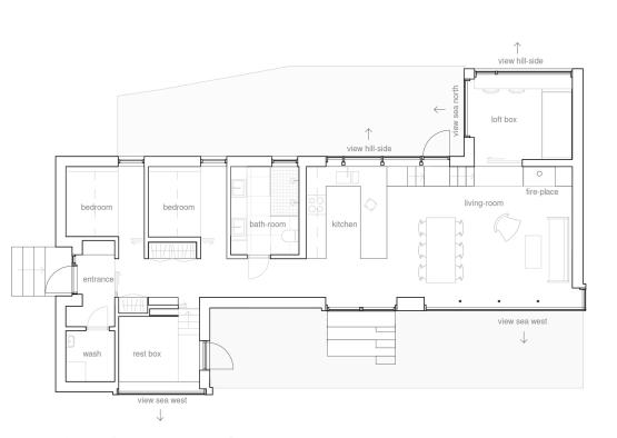 Though the cabin is a relatively small structure for a 5 person family, the space utilisation is cleverly mapped out. The main living room acts as a sort of communal anchor, while the family can branch off a half level up or down to retreat into solitude.