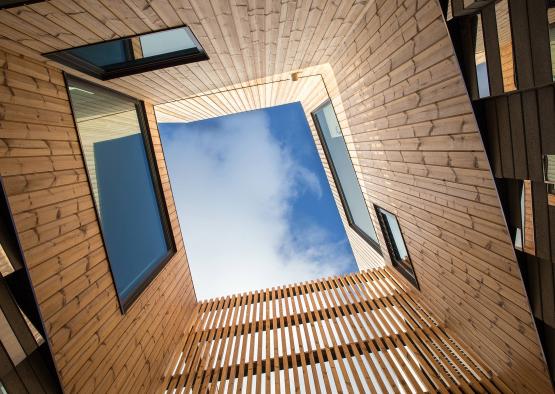 Cladding: The entirety of the new building is clad in a Lunawood product, which is a high-quality Finnish thermowood. Where the wall is solid, a shiplap profile has been used.