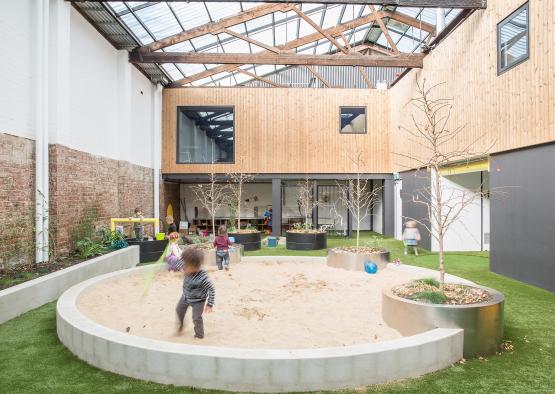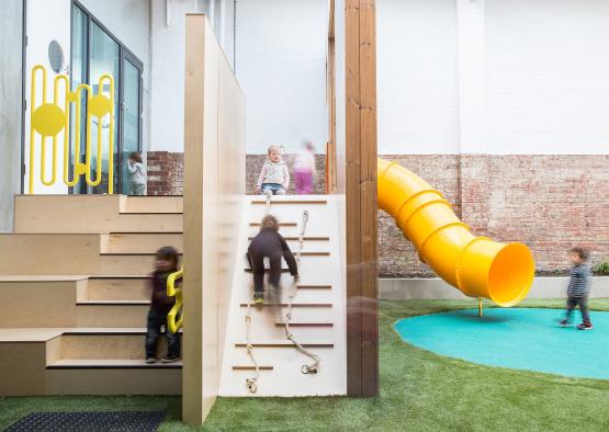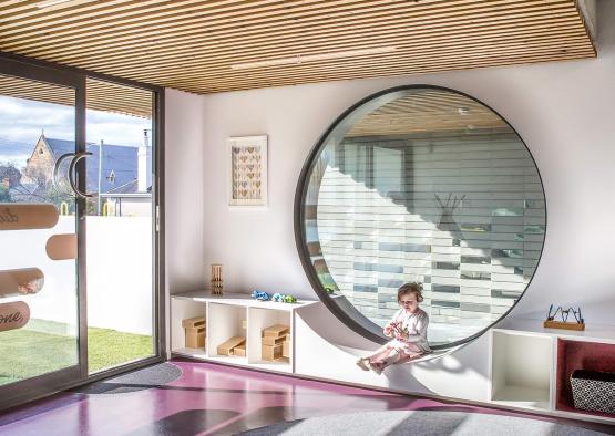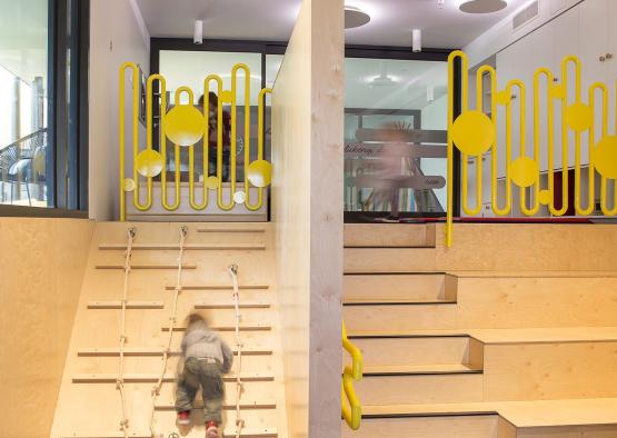 The stacked storeys are reminiscent of traditional timber ‘jenga’ blocks, each move creating an opportunity with double height play spaces and voids that utilise timber battening, allowing the sun to throw patterns over the interior. Timber is an integral material throughout the building across all scales, inside and out: original trusses are retained and showcased in the main play space, timber panelling is used in communal spaces to provide a natural and welcoming environment, and timber handles have been playfully painted as part of the joinery.