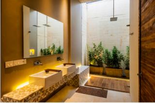 Teak, harvested from sustainable plantations, features in the distinctive facade, furniture and some flooring. Most of the floor area is sandstone, ensuring uniformity with the roof tone.