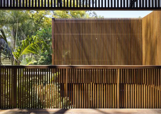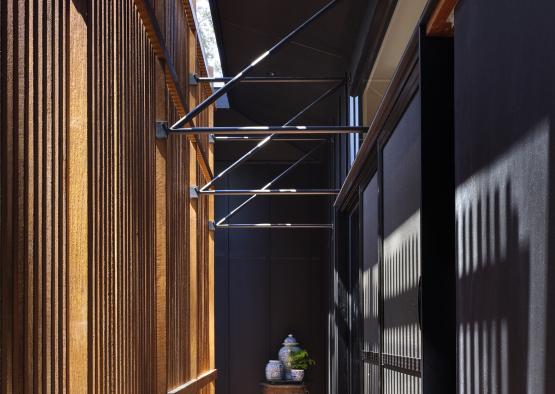 The scheme emerged from three key considerations: defining a clear parti and entry sequence, modulating the old and new timber elements and responding to the existing building. A timber ‘veil’ was introduced to the façade providing privacy and modulating the elements. Replacing fixed glazing and narrow decks with operable walls and ventable clerestories allowed the home to become more climatically responsive.