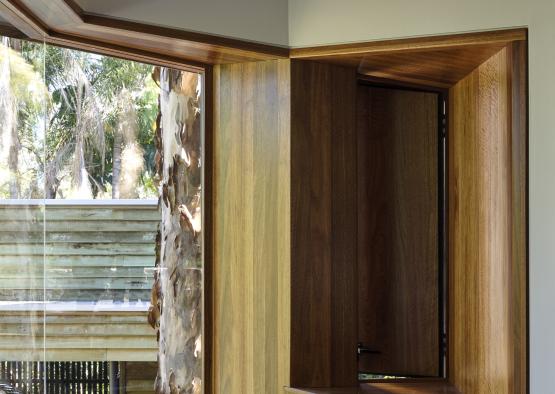 All of the timber veneer is Spotted Gum with a crown cut. Spotted Gum was selected for its durability and subtle nuances which underpins the sub-tropical design aesthetic. The majority of new timber work in the house (screens, decks, flooring etc.) were also Spotted Gum, the materiality of which defined the parti of new elements and insertions within the existing building fabric.