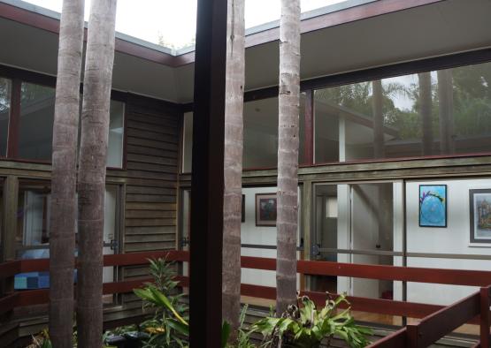The majority of the glazing on the house is aluminium, however timber windows were incorporated to denote the projecting windows at the entry and master bedroom. The timber windows also integrated with internal seats and nooks which provide areas for the display of artefacts and for respite.