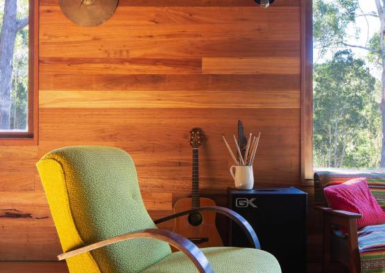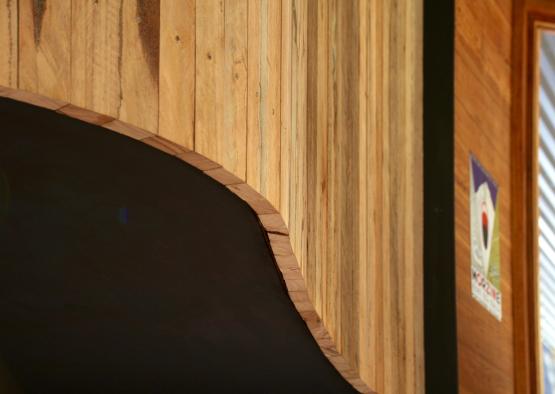 Blackbutt floorboards at 140 wide are used throughout the home, with the boards wrapping up the walls and onto the roof to serve as lining as well. The large profile of the boards gives the rustic atmosphere of the home, which has a soft ambience from the imperfect personality of the timber.