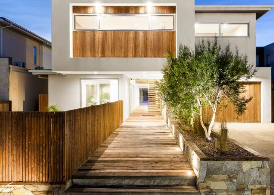The exterior was very much dictated by design restrictions within the Martha's Cove Estate. The resulting aesthetic mixes three element of vertical timber battens, rendered walls, and stone fencing. An added feature element is the timber walkway made up of the salvaged timber beams, which continues through the house, courtyard and out into the backyard.