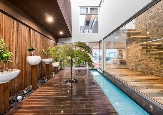Materials are consistent from indoor to out, with stone and timber providing cohesion through a varied design influence.