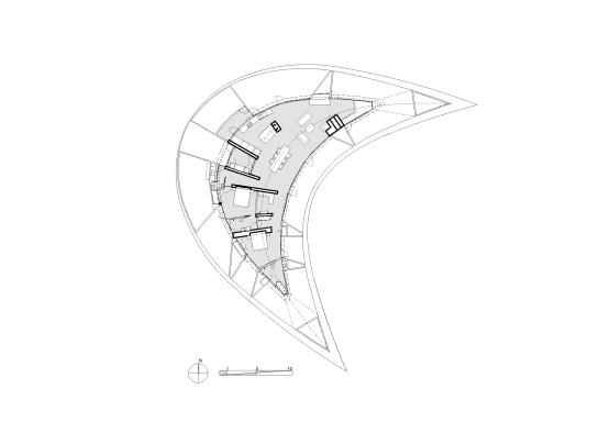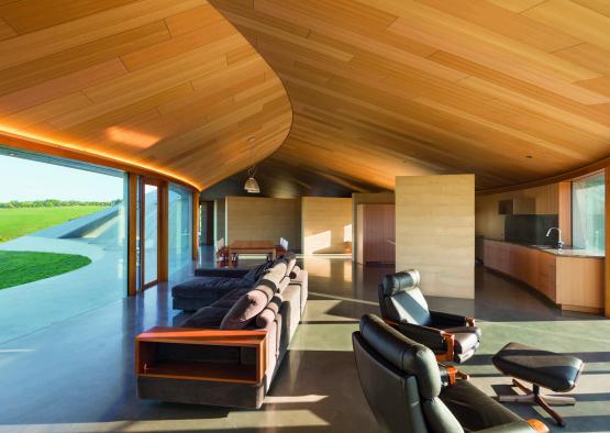 The unusual roof geometry becomes the most intriguing inside the home. The curved central beam directs the eye through the home, gesturing movement through the space. The concave side of the roof embraces the central courtyard, inviting constant attention to nature.