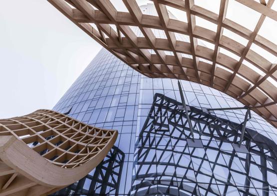 Using an innovative double glu-laminated prefab structure, a small company – innovarchi – has created a unique and highly functional timber sculptural element to compliment a major tower development.