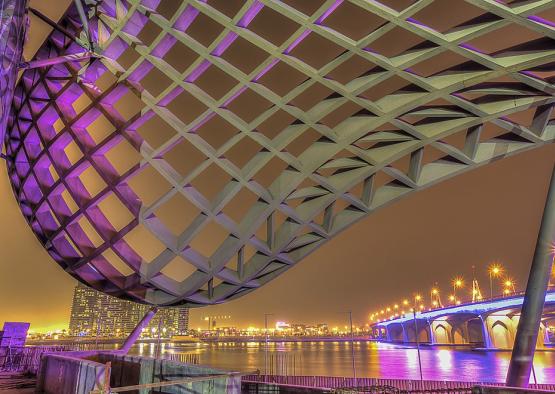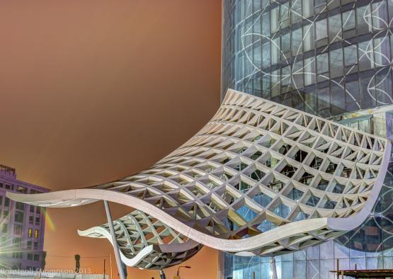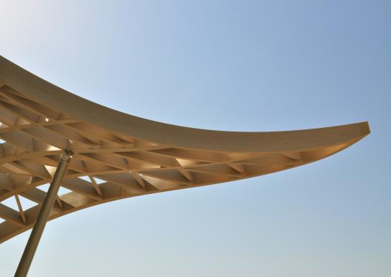 The Timber Canopy shade and cooling structure at the base of the D1 Tower in Dubai was influenced by traditional wind tower technology and passive climate control. The expansive timber sculpture moderates between three contextual scales. The tower itself is an urban landmark and at 80 storeys high is visible from miles around. The scale of the smooth glass skyscraper needed a device at the ground to knit the building into the site and surrounding landscape as well as to create a human scale at the building's edge. Adjacent to a grand bridge over the main waterway of the City the site marks the arrival and departure from the new Cultural precinct. Situated on the edge of the Dubai Creek, D1 occupies the place where the traditional Dhow boats were built. The timber Canopy pays homage to this crafting and curving of wood and is a reminder of the site's place in the City's history. Remnant fishing baskets and nets found in the landscape inspired the original conceptual studies for the final flowing forms.