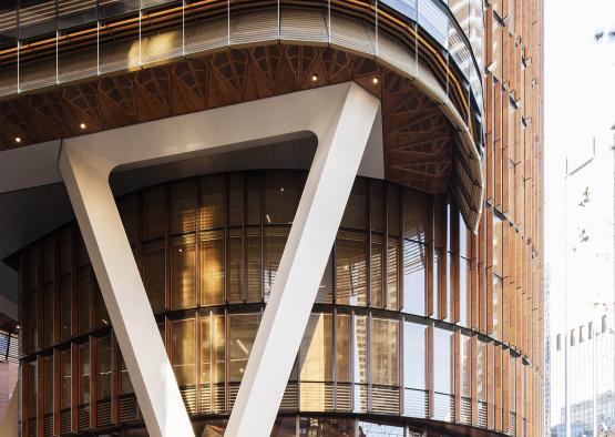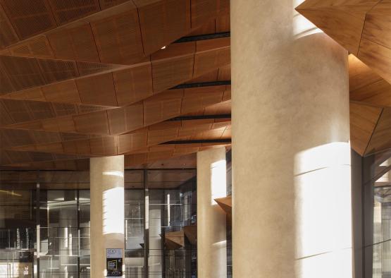 The EY Centre and its innovative use of timber screens in the facade, as well as in the foyer ceiling and in the suspended awning enables the building to appear as a ‘tower of wood’ rising out from the greyness of its neighbours. The EY Centre uses a ‘world-first’ closed cavity facade with a timber blind system. The timber blinds adjust automatically according to the sun’s natural cycles. This progressively adjusting timber screen filters the light into a warm timber glow, resulting in a significant cost and energy saving on heating and cooling of the building. From the outside, the building changes in appearance as the sun moves. A suspended awning of folded timber inspired by the eucalypts at the water’s edge reaches out and shelters the footpath, reflecting light into the lobby interior. The EY Centre is a different type of sustainable city tower: warm, human, and responsive.