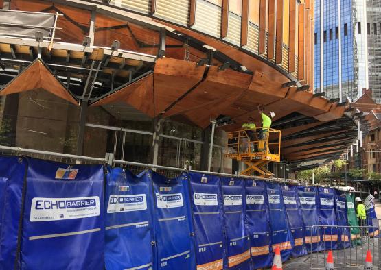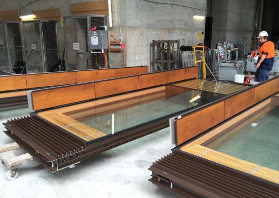 Foyer Awning: The external soffit of the foyer awning uses 260 square metres of marine grade plywood and 230 linear metres of Engineered Laminated Timber