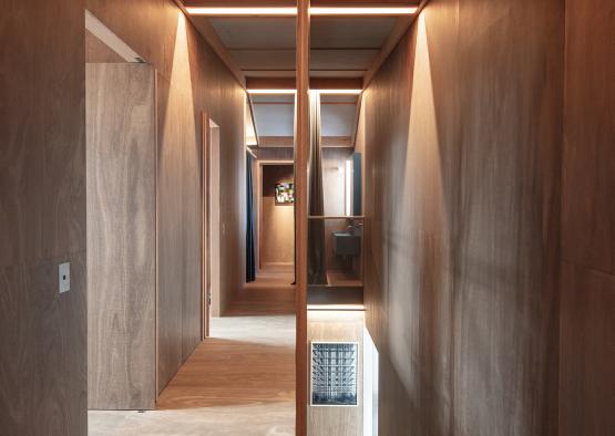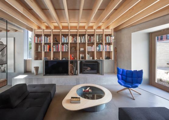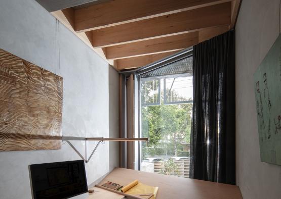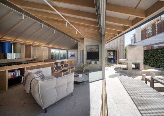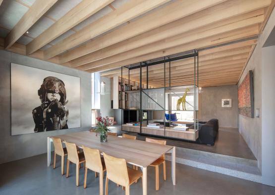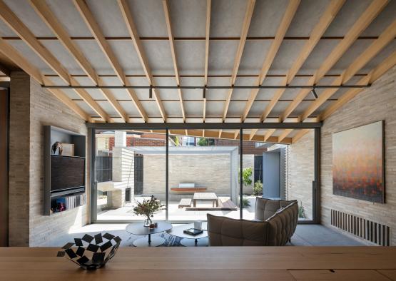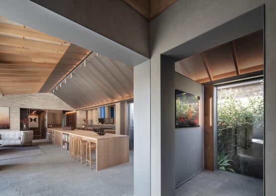 Victorian ash is utilised in structural glulam beams, open shelf joinery, solid timber bench tops, windows, doors, and custom furniture and detailing throughout