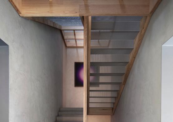 The metal mesh and timber staircase becomes a visual link and practical link between spaces. The two materials contrast beautifully, with the porousness of the mesh bringing attention to the weight of the raw timber.