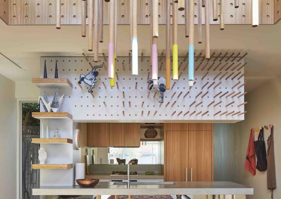 Our design strategy is always to celebrate the particularities of the project. While exploring the functional opportunities of opening and closing the windows in the skylight as well as incorporating shading devices, the use of the timber dowel offered an opportunity to become the rod to open the louvres as well as a decorative chandelier over the dining table. The chandelier can be reconfigured, with the coloured elements highlighting which dowels can be removed and repositioned to change to dowel display.