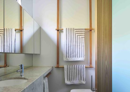 The use of the dowel then extended to is application within the kitchen as an art display device, shelving and support legs for the concrete benches. The dowels are also used as display ledges for the client’s extensive art collection, doors pulls, towels rails and wall hooks amongst many other things.