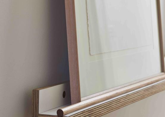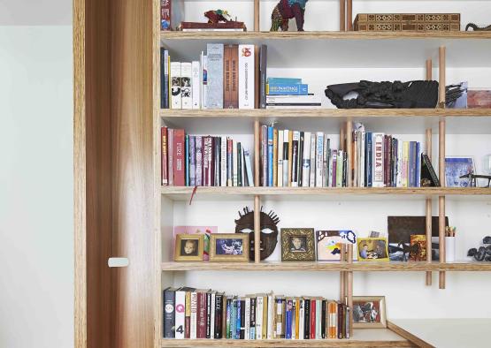 The study takes its cues from the kitchen and clerestory windows, reinterpreting the dowel as a bookend and desk leg in the study space. The study includes the use of display ledge that incorporates the dowel as a means to anchor it to the wall. The design of this display system is highly flexible, allowing the artwork to be rotated over time.