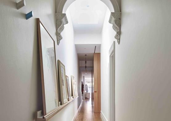 Tasmanian Oak was used for its versatility and use in a wide range of applications, from its use in the cladding in the skylight to the kitchen cabinetry. Its ability to be glue-laminated to cover long spans meant it was ideal for our project to cover both the kitchen and hallway, creating a unified material along the hallway. Consistency of colour and grain creates a seamless transition between the spaces.
