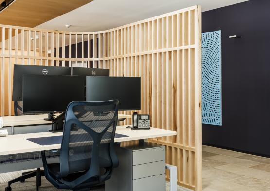 A unique building envelope informed the curved plywood interior of this modern office environment.