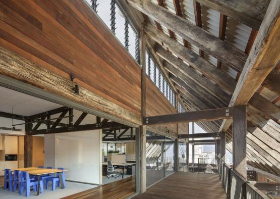 The office space on Level 1 spills out onto a timber balcony that overlooks the market stalls below.