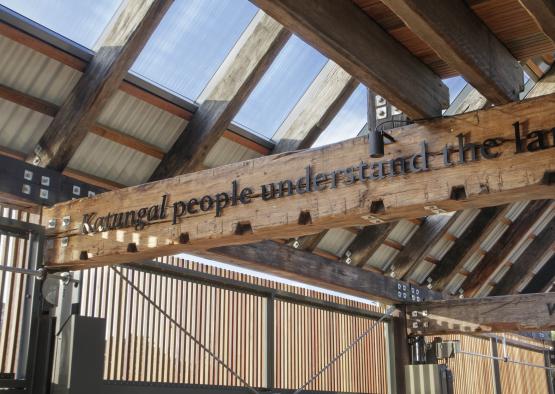 The salvaged native hardwoods feature artworks and inscriptions, and stories are interlaced throughout the Eden Welcome Centre. Each piece of timber tells a story of its former life remaining scarred and raw, with a deliberate decision not to re-mill the timber with a dressed all round finish.
