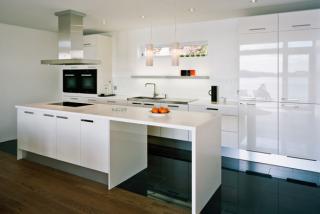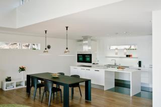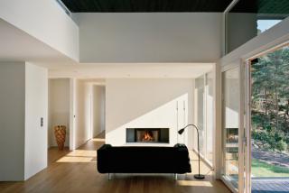 Interaction with the view and a poetic transition from inside to outside lends richness to the stark interior. The rough-sawn weatherboards catch jagged shadows with their tapered profile. Moving inwards, this inky timber layer is then seemingly 'peeled back' to reveal the smoother Canadian cedar that is ship-lapped in a shallower profile. This middle layer is the transition to the pearly white interior with its smooth and uninterrupted surfaces that are free of cornices and superfluous trims. It's an interlocking of volumes in a simple but exciting spatial experience. Stark yet harmonious contrasts in texture and tone of materials give clarity to the architectural ideas.