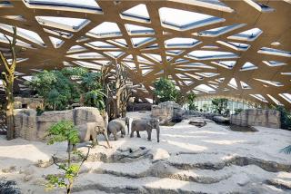 An underground underwater observation facility allows visitors to view the elephants swimming, while elevated pathways allow interior and exterior views.