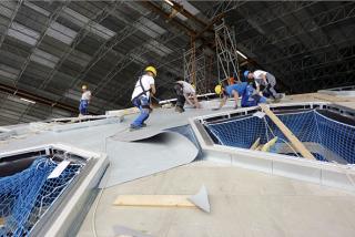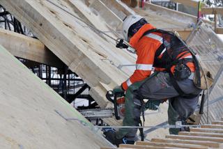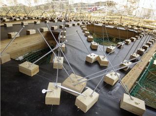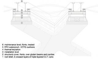 Wooden edge beams and spacer blocks form the support of a thermal insulation level closed by a structural layer of Kerto on which sits a network of technical distribution channels onto which the ETFE cushion frames are attached. The frames hold the waterproof FPO felt layers, topped with an outside Kerto layer (with a preventive autoclave treatment), serving as accessible support for maintenance.