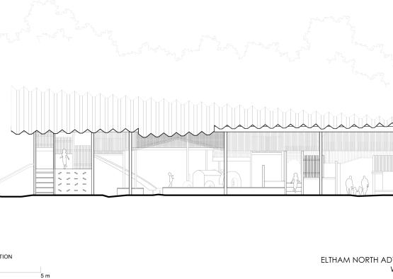 The two defining exterior elements, both structurally and aesthetically, are the large structural steel roof sheeting, with deep corrugations, and the generous prevalence of raw timber. 10 cubic metres of timber was used just for the cladding and posts. Raw materials provide the agricultural feel, along with economic construction, and approachability.