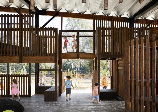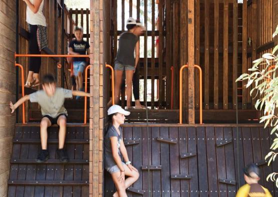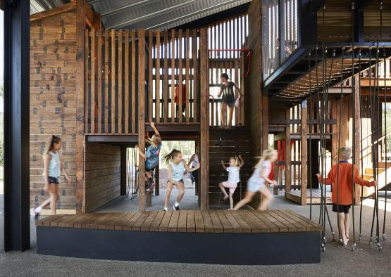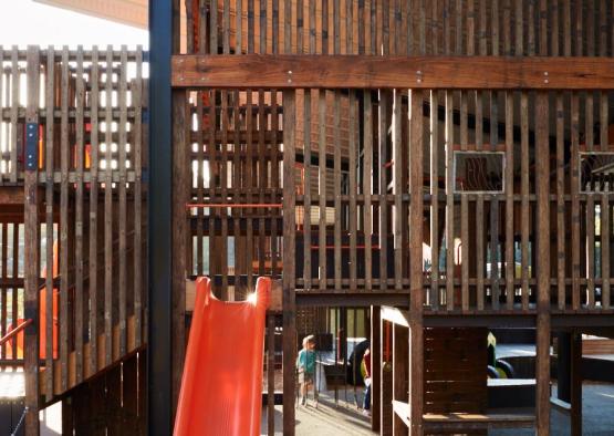 The recycled spotted gum makes up most of the structural elements, along with timber screens and balustrades, seating, raised platforms and play equipment.