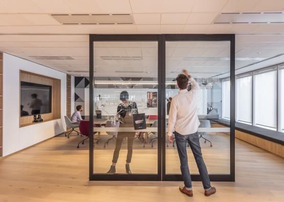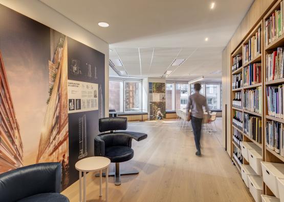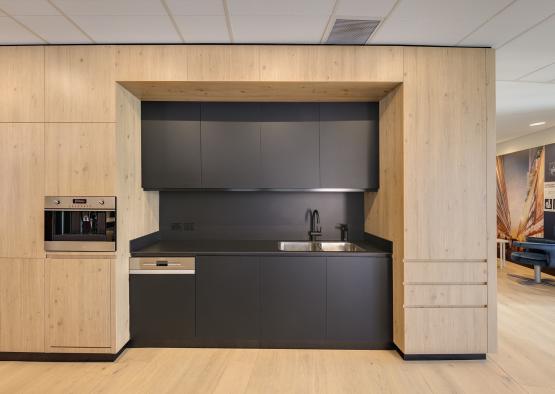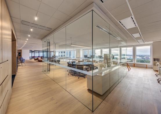 Wide oak timber floorboards used throughout with a matt, low sheen oiled finish, create a natural, textural backdrop to the workplace. This contrasts with charcoal grey pin-up and drawing zones, black doorframes and fittings together with black work tables. The transparency of the practice operations are reflected through glazed sliding meeting room walls.