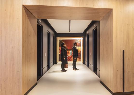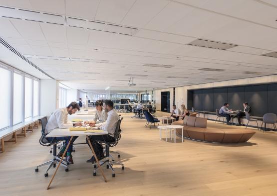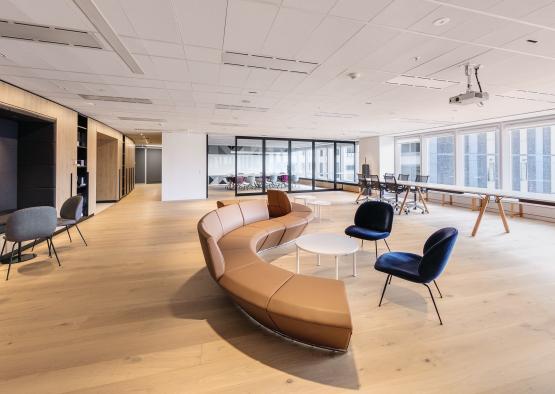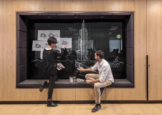 The project vision was to create a contemporary fit-out to reflect PTW’s culture and design process – an environment that would energise and inspire client and stakeholder interaction and engagement with our in-house team, working together in new and innovative ways. Material choices, including English oak flooring, were integral to the success of the project. The visitor arrives in the heart of the studio, a welcoming lobby/forum which frames a stunning view over the Royal Botanic Garden and Sydney harbour, with multi-purpose usage ideal for client and team use alike. Wide floorboards which extend throughout create a calm, durable backdrop that is boldly contrasted with charcoal grey built-in seating, fittings and fixtures. The timber flooring is also ideal for the more intimate, private spaces for quiet work and reflection, bringing nurturing qualities of warmth and connection to nature.