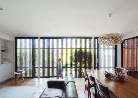 The interiors are open and light, with the exterior slatted screen visible from inside the front living room where the timber combines with the outside greenery to create a sense of connection to nature.