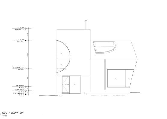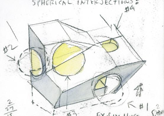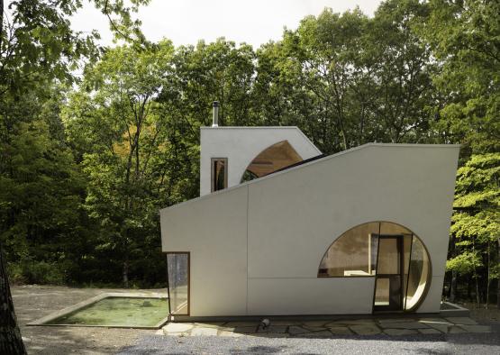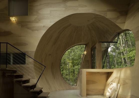 The house’s geometry is formed from spherical spaces intersecting with tesseract trapezoids. The results of these spherical intersections can be felt at the entry porch, which is an orb of wood carved out of the main structure.
