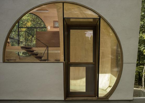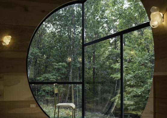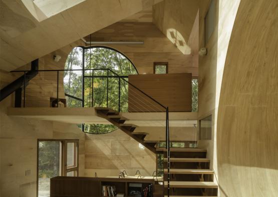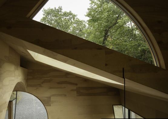 The absence of plasterboard was intentional. Birch plywood was used for all wall linings. The spherical intersection space was also crafted in curved, thin wood layers. All natural oiled wood and plywood interior finishes are part of the arte povera inspired materiality and economy of this place of wabi-sabi.