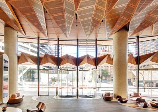 On the ground level, to the street and public foyer, a suspended awning of folded timber planes stretch out, sheltering the footpath and reflecting light into the lobby interior. This awning was intended by the designers to curve and fold like a row of trees.