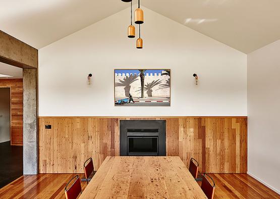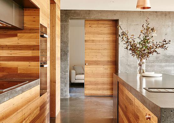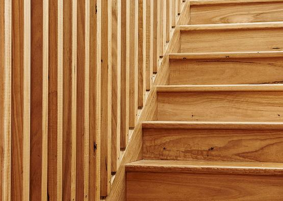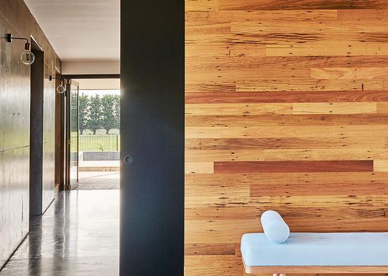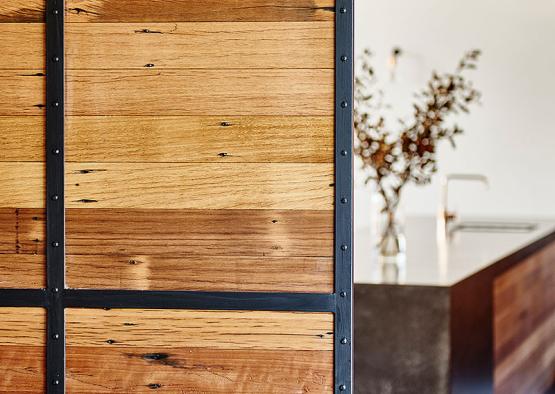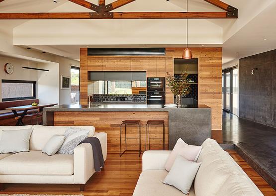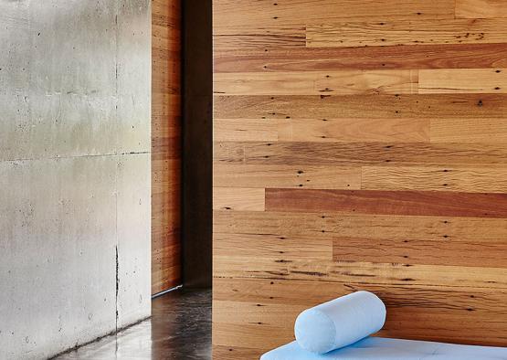 The key products include double black concrete floor and wall; recycled blackbutt from Timber Zoo; and recycled spotted gum for the custom made timber trusses. These custom made timber trusses were made on site by carpenters using traditional methods and lifted into position by a crane.