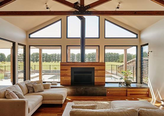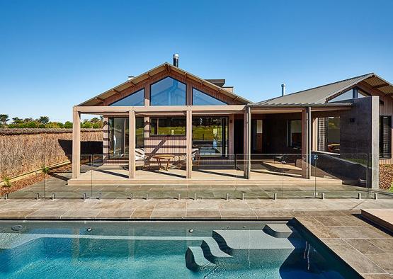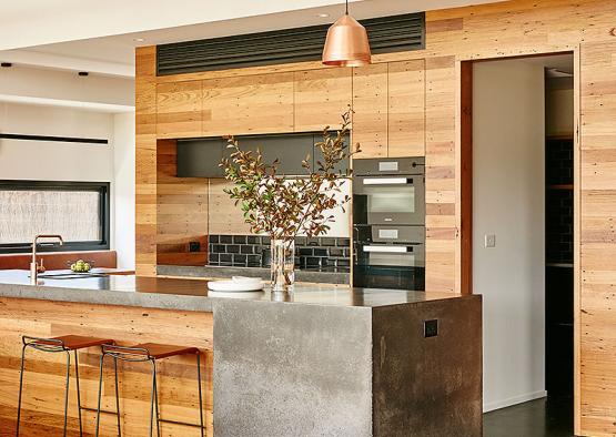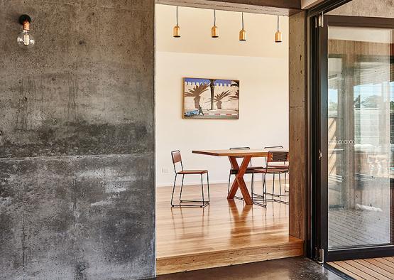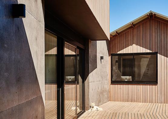 Set on a coastal golf course estate, this comfy family home celebrates the contrast of concrete and timber.