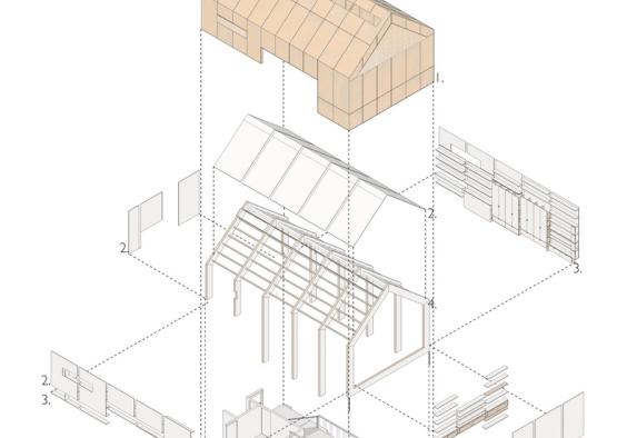 All of the plywood joints and components were prefabricated and painted off-site by a local joinery company to allow for quick and simple on-site assembly. Using plywood instead of plaster limited the need for contractors on site, reducing time and cost on the project. The PEFC and FSC certified birch plywood was sourced from the Ukraine as 1200 x 2400mm boards. Even the thicknesses of the columns and beams are proportionate to the 18mm boards. The columns are 162mm wide- the thickness of 9 boards, the beams are 126mm, or 7 boards thick, while the joists are made from three widths of the boards, at 54mm.