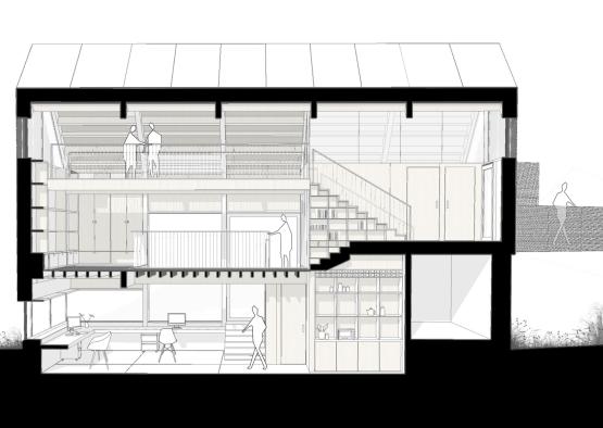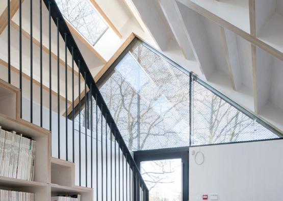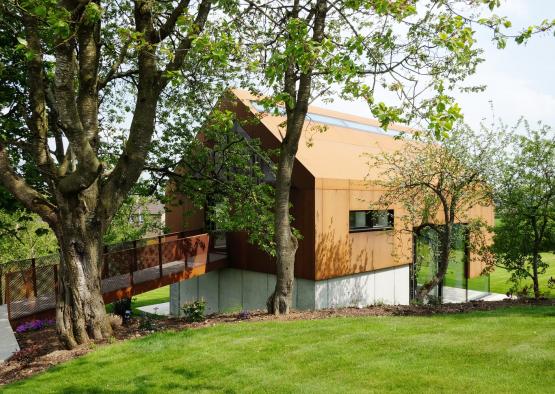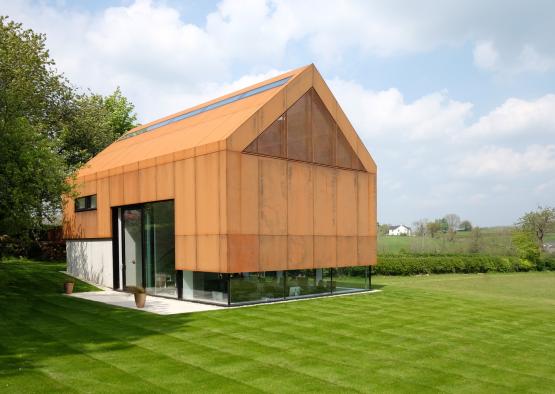 The building's exterior form references the simple gable of local historical structures. The contemporary Corten steel cladding also references the weathering metal of farmhouse structures in the countryside. Perforated Corten clads the entire upper half of the building, allowing a generous filtering of light into the building whilst forming a protective weather resistant shell. The lower level of the structure remains unclad, with the exposed raw concrete and glazing forming the exterior layer.