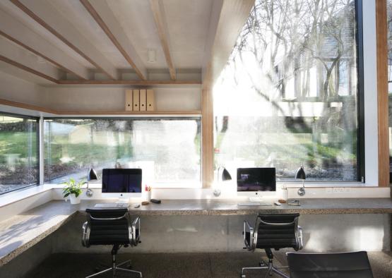 The glulam structure and concrete materials have been left exposed in the internal structure, leaving a rational and raw finish that nods to the processes of its construction.