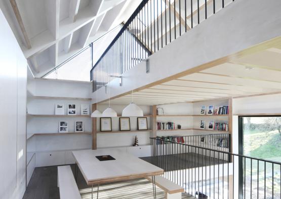 The large wrapping windows offer panoramic views around the countryside property, bringing the outside in and creating a bright and open volume.