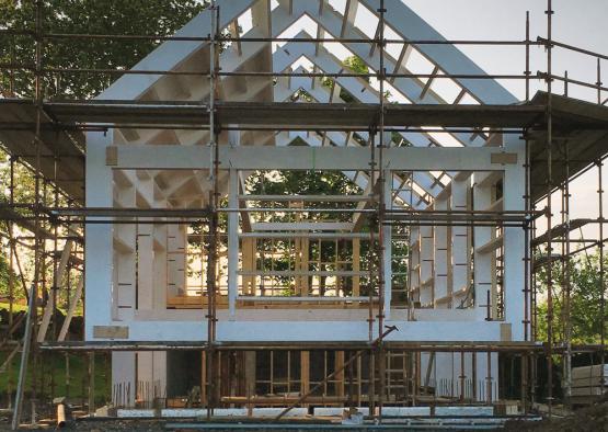The engineered timber frame is then further braced with an 18mm birch ply lining, and waterproofed with a membrane on the exterior of the frame. 200mm of insulation is then fixed to the outer face of the frame, with 25x50mm battens securing the batts to the frame. The 4mm corten steel cladding is then mechanically fixed to the battens through the insulation.