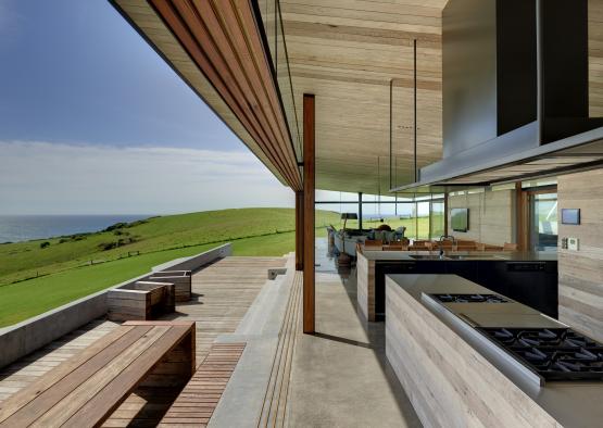 Operability, outlook and engagement with the spectacular landscape were key to the brief. Generous openings are framed by custom hardwood window and door joinery. The quality is exemplary. Items include fully glazed operable walls over 21m long, and sets of sliding sashes with 340mm wide heads that enable a seamless connection with the outside.