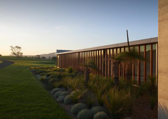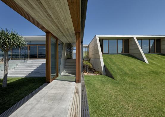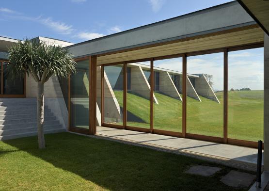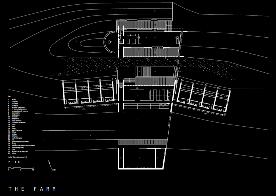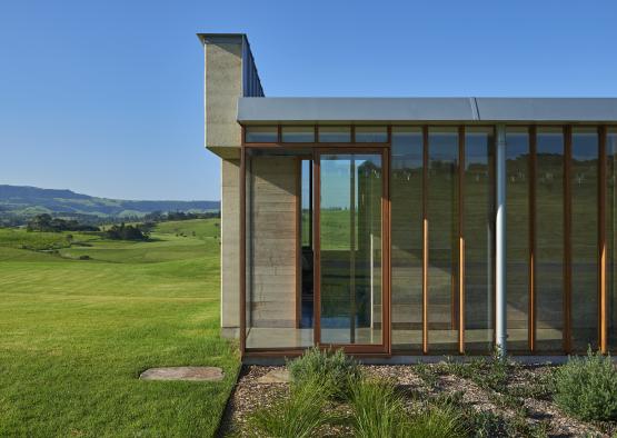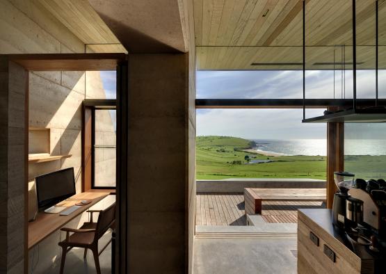 The farm is located on a windswept coastal headland. It is a single residence that accommodates multiple families. It appears as a series of sculptural rammed earth walls embedded in the rolling grassland.