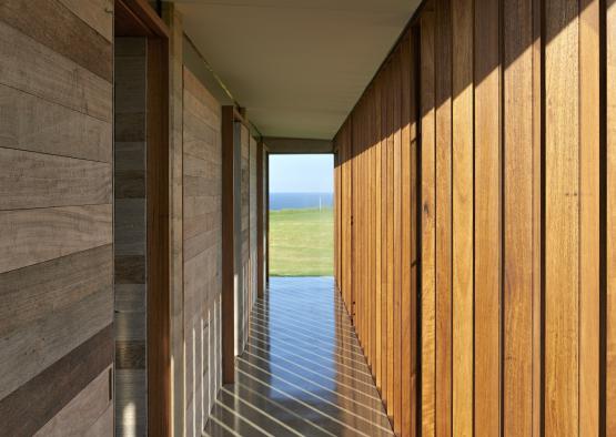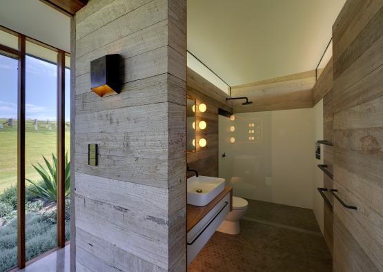 A minimal palette of natural materials reflective of the site is key to the design. The soft grey recycled timber surfaces unify and complement the rammed earth. In concert with the rammed earth structure, the recycled timber imbues The Farm with a remarkable organic quality that is expressive of the coastal site.