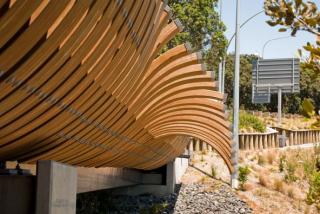 A bridged walkway whose main features are curved timber glulam ribs, geometrically arranged to create a sinuous undulating, unfolding form, by Beca Architects on Auckland’s North Shore.