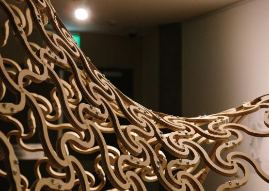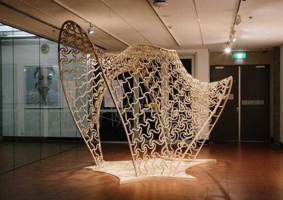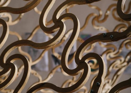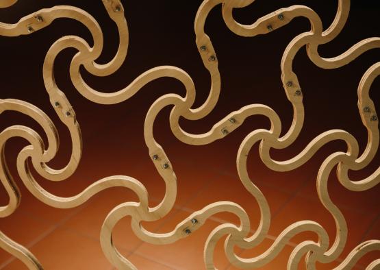 FlexMap 2 is a doubly-curved bending-active structure made from flat 2D spiral panels. The panels were CNC cut out of 15mm thick plywood sheets. The mechanical properties of each panel are locally tuned by varying the shape of its spiral. The resulting panels perform as variable stiffness elements. Once assembled together, each smaller piece helps to form the overall geometry of the designed structure