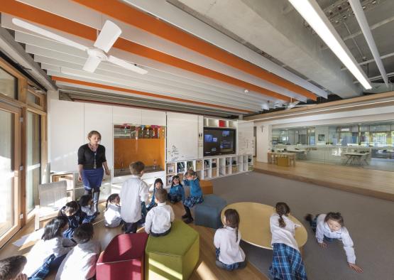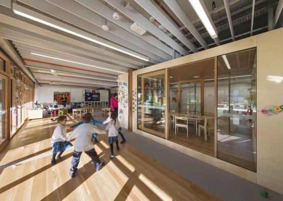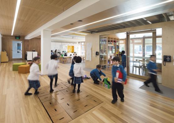 This is a new primary school reusing a 1970 three-storey former Telstra training centre. The design brief was to create an inspirational educational space that provides flexible, open learning spaces to suit small children and accommodate a high level of technology. Timber was fundamental to achieving this, it plays the critical role in producing a warm and natural environment that counterbalances the partially-exposed concrete structure of the building. Timber floors and acoustic ceilings, movable screens, joinery that includes shelves, built-in seats and withdrawal spaces, enable different teaching configurations. The design boldly removes all fixed walls between three teaching spaces. All spaces are connected by a central timber spine created by elevating a ‘bridge’ one step above all other spaces. In the context of a school the true innovation here is in the flexible space and the use of timber as the primary material.